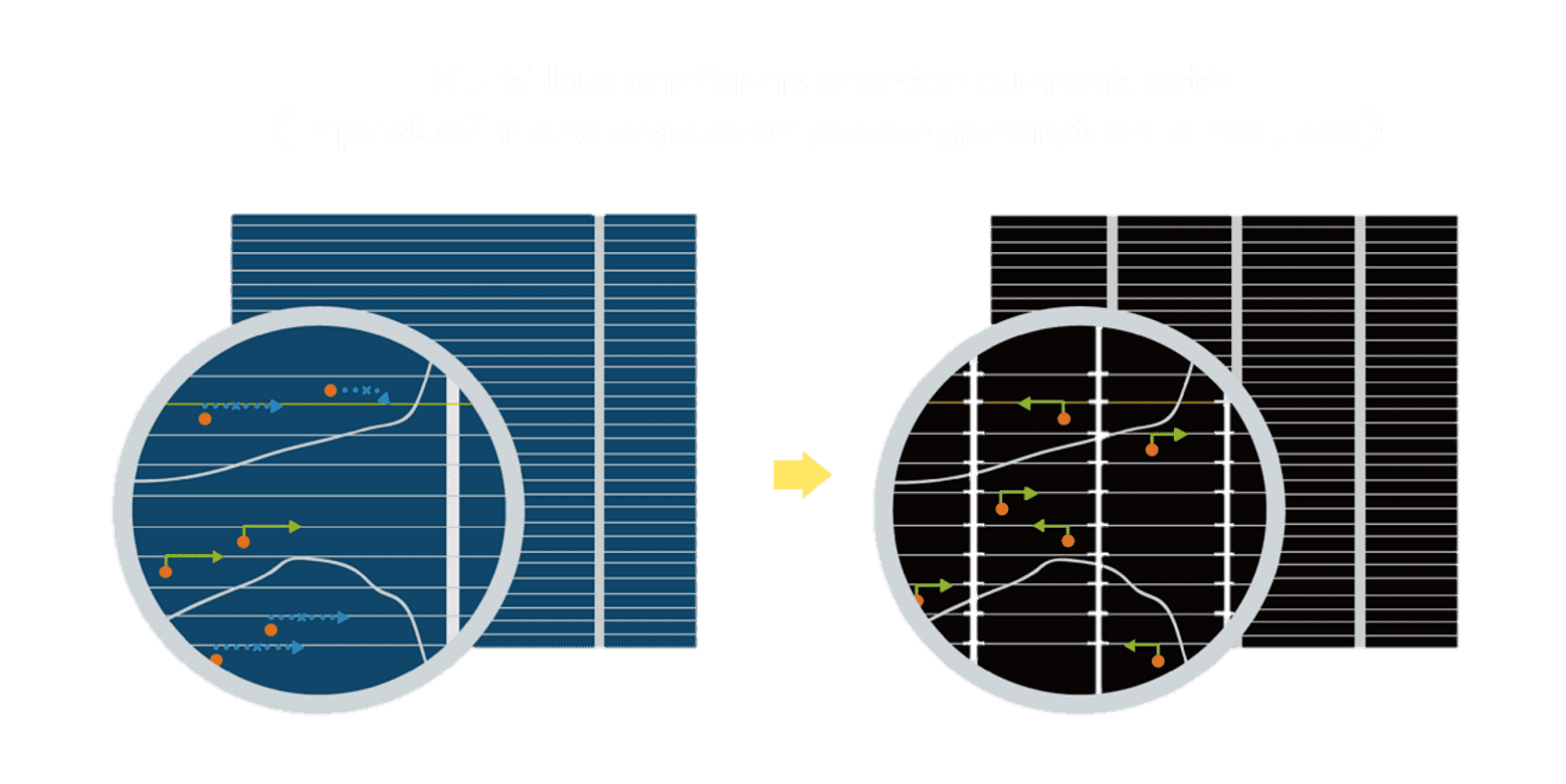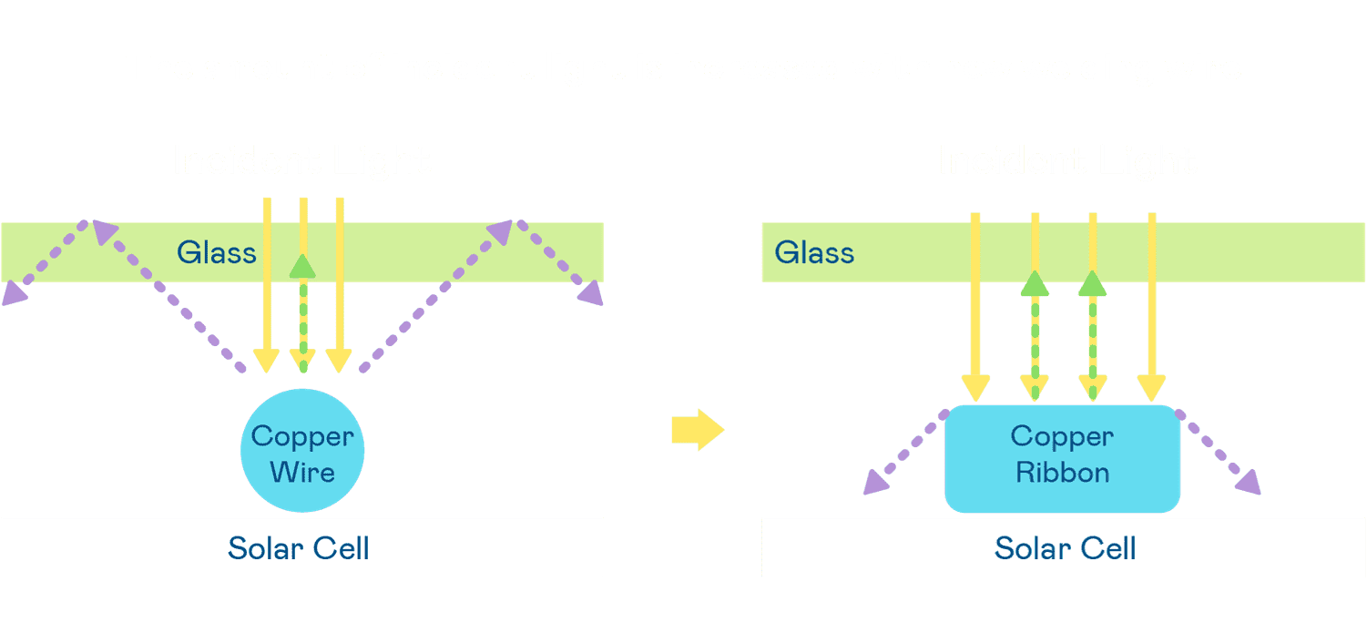 • 电池使用多条铜导线 (Copper wire) 于电池片上形成较短的电流路径,,,,提高电流收集效率,,采用圆形设计的铜导线较传统扁平式的铜焊带 (Ribbon),,可增加入射至电池的光线量。。。。