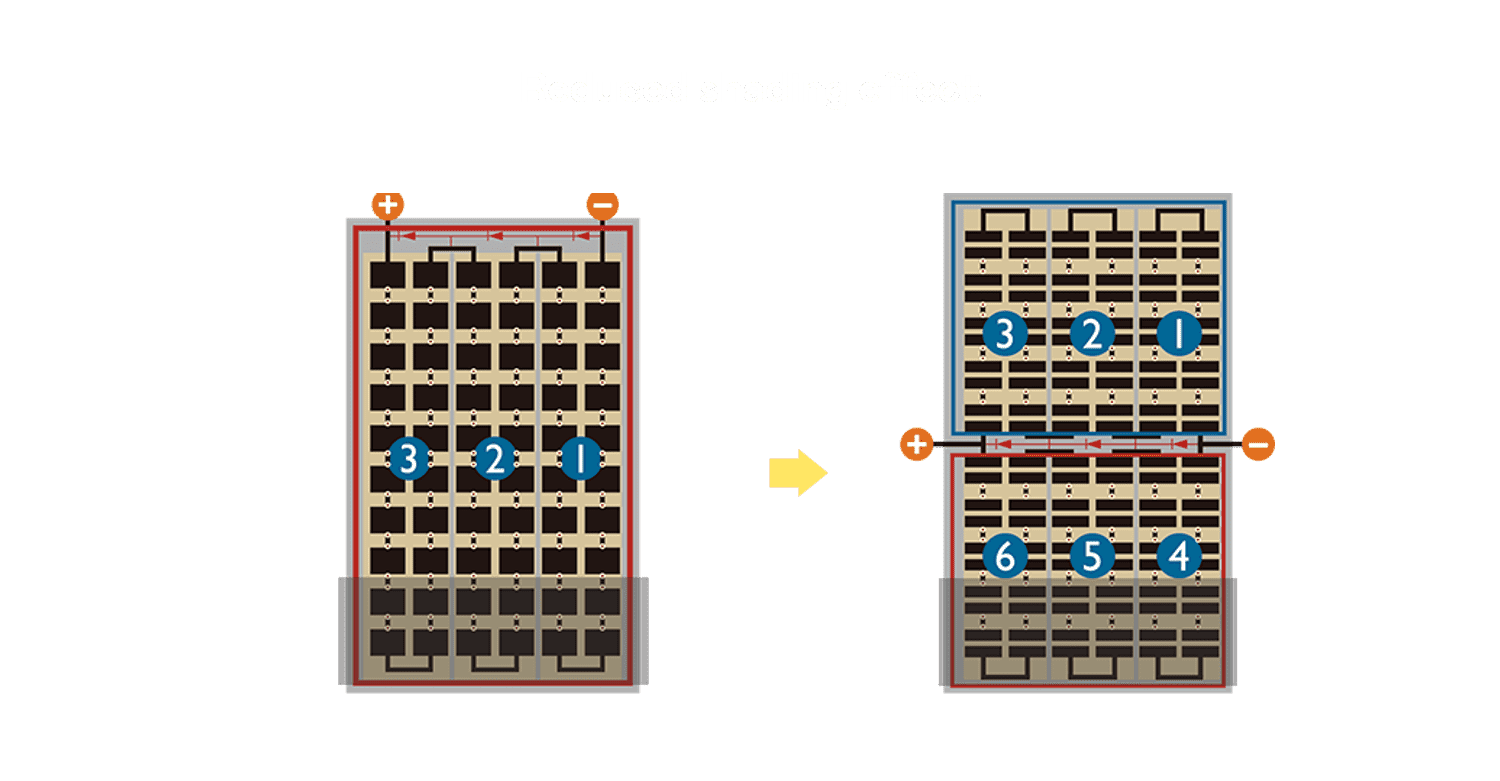 • 结合半切电池,,,,降低遮阴影响、、、、提升模组抗隐裂能力、、并减少电阻损耗,,进一步提升模组发电效能。。。