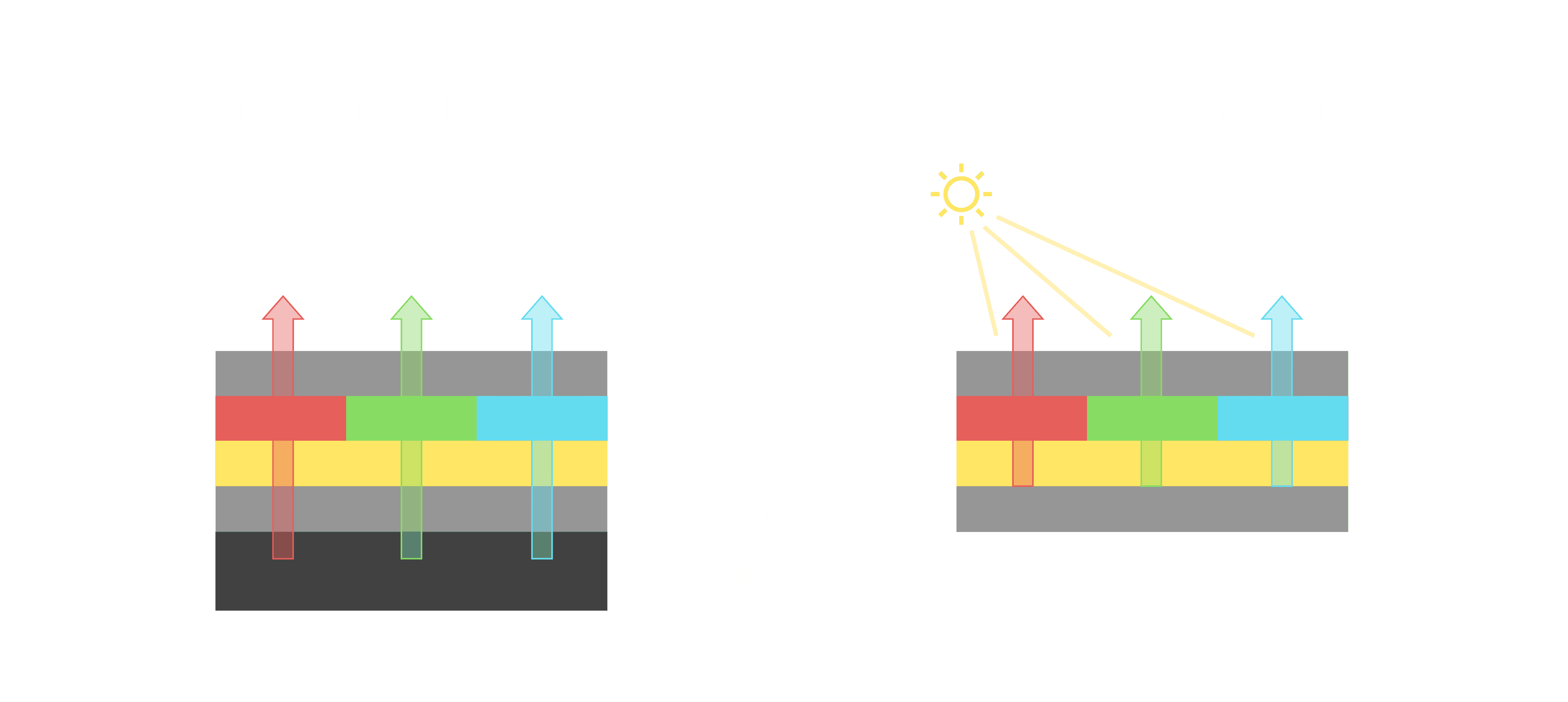 与传统需搭配背光单元的液晶显示相比,,,,反射式液晶技术不仅更省电、、、、更轻薄,,且即便在艳阳下仍能清晰显示。。。。此外,,,,少了背光单元,,,,也大幅降低了 LED 蓝光伤害眼睛的疑虑。。